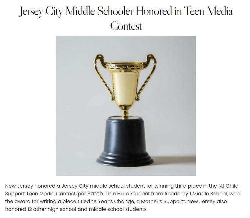 July 27, 2021 (Jersey City Patch ) -- A Jersey City middle school student was honored by the state for winning third place in the NJ Child Support Teen Media Contest. Tian Hu, a student from Academy 1 Middle School, won third place for his written piece "A Year's Change, a Mother's Support." Hu was one of 12 New Jersey high school and middle school students honored by the state. Click the headline for more.